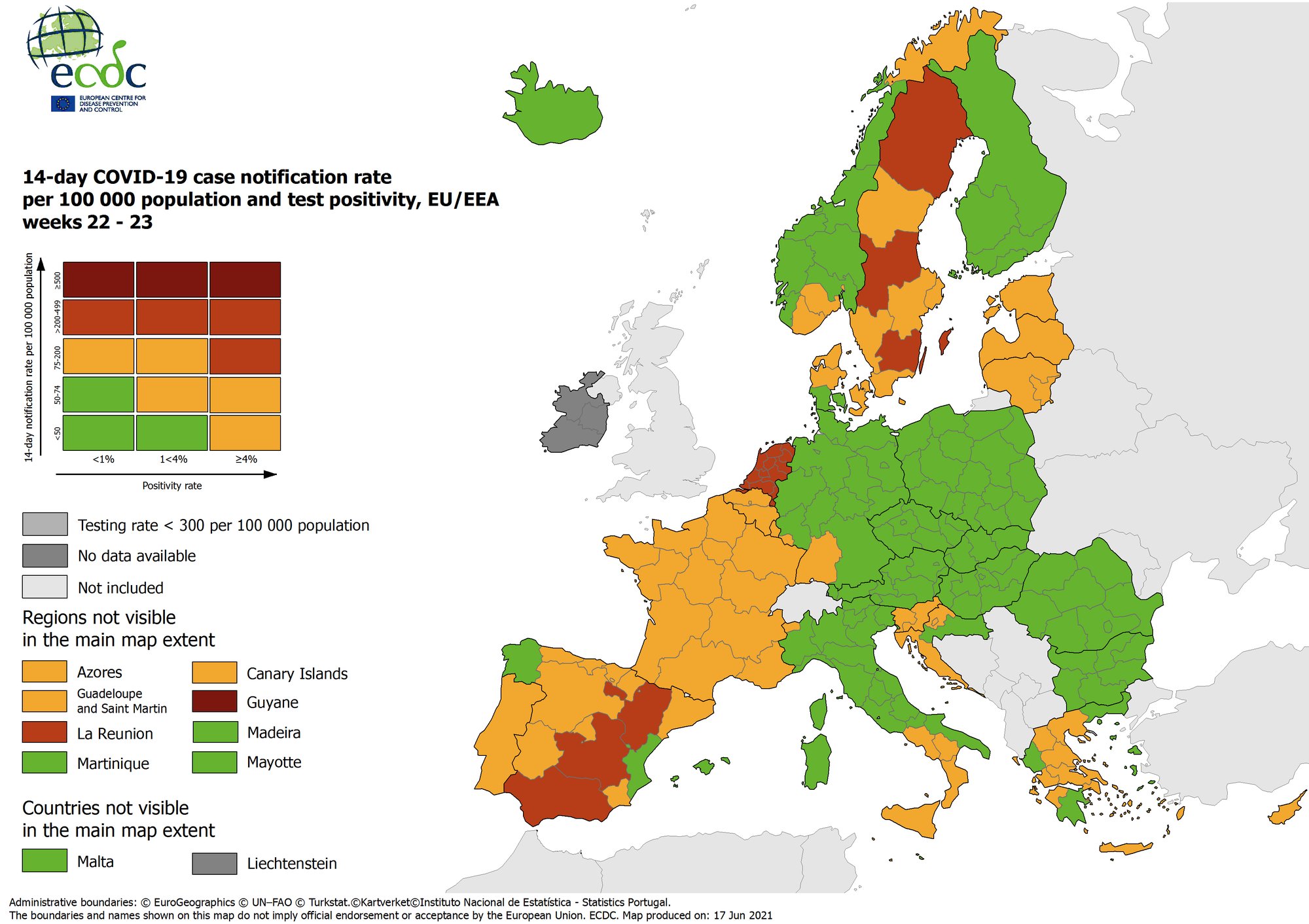 Track COVID-19 local and global coronavirus cases with active recoveries and death rate on the map with daily news and video. Het Europees Centrum voor ziektepreventie en bestrijding heeft op donderdag24 juni hun kaart aangepast met daarop de gecombineerde indicator van een 14-daagse meldingspercentage testpercentage en testpositiviteit zoals bijgewerkt op 24 juni 2021. At the request of Member States data on the daily number of new reported COVID-19 cases and deaths by EUEEA country will be available to download from 11 March 2021.